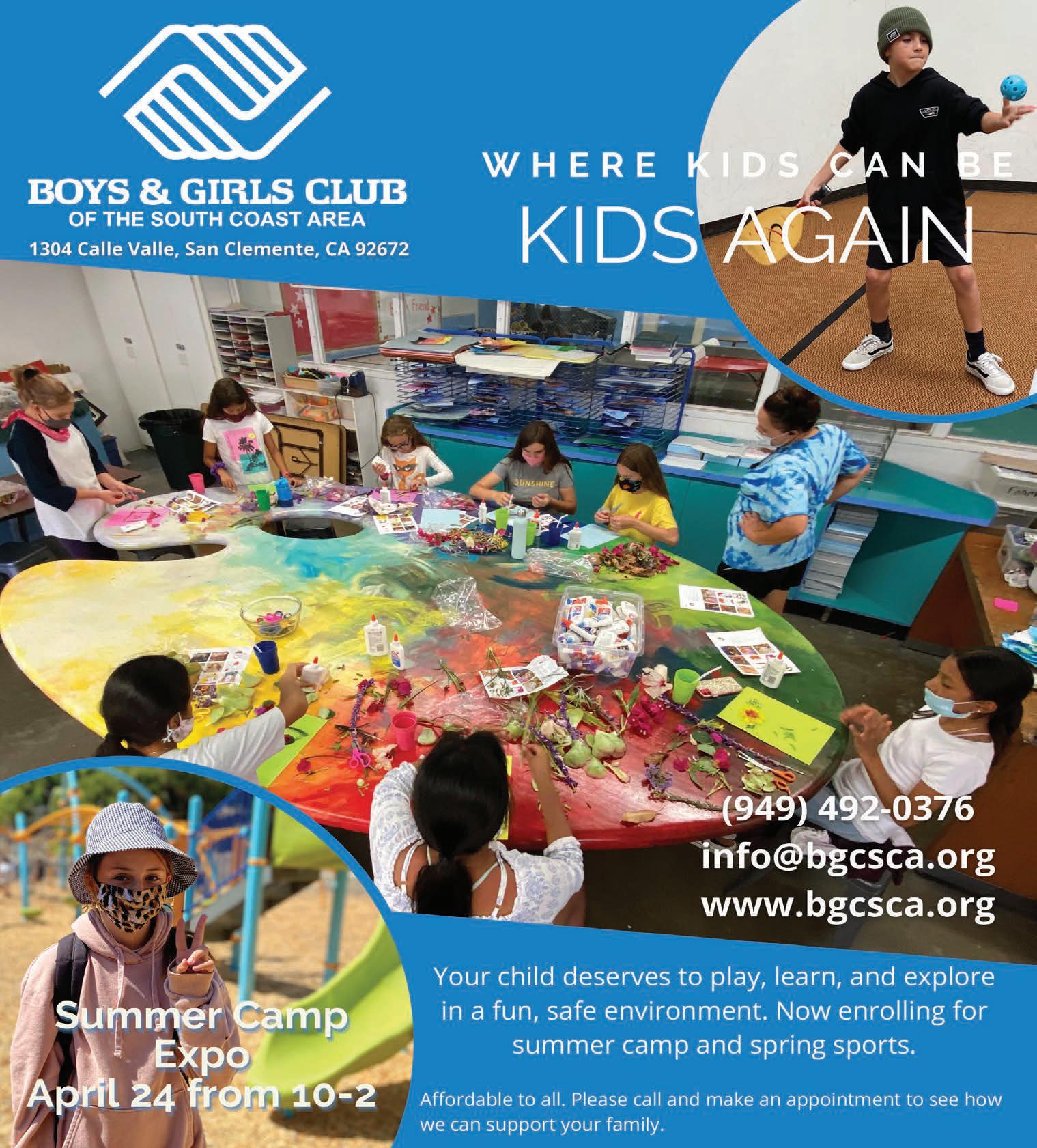 The Boys & Girls Club of the South Coast Area is proud to be THE place where kids can be kids again. Join us after school, for spring break, or our 10-week summer camp. Affordable for all. Call us at 949.492.0376, email info@bgcsca.org, or visit bgcsca. org for more information.