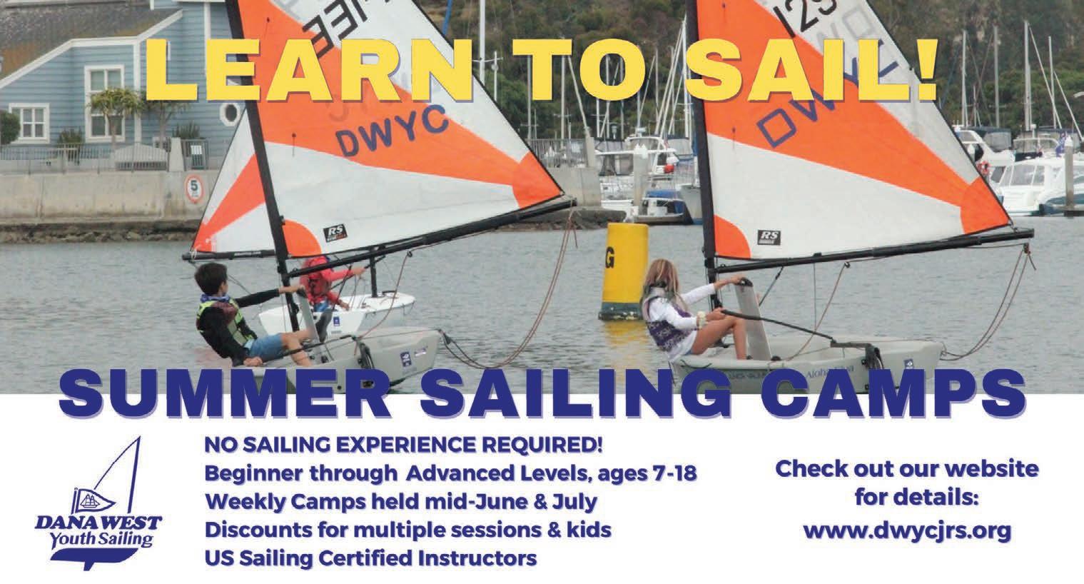 Dana West Youth Sailing hosts summer sailing camps at Dana West Yacht Club in Dana Point Harbor for all skill levels, ages 7-18. US Sailing Certified instructors run weekly camps, Monday - Friday, in mid-June and July. Beginners will learn the basics of sailing; experienced sailors will continue to hone their skills. Our fleet consists of RS Teras, CFJs and 420s. There are discounts for early, multi-week, and multiple-kid registrations. For more information/registration, visit dwycjrs.org.