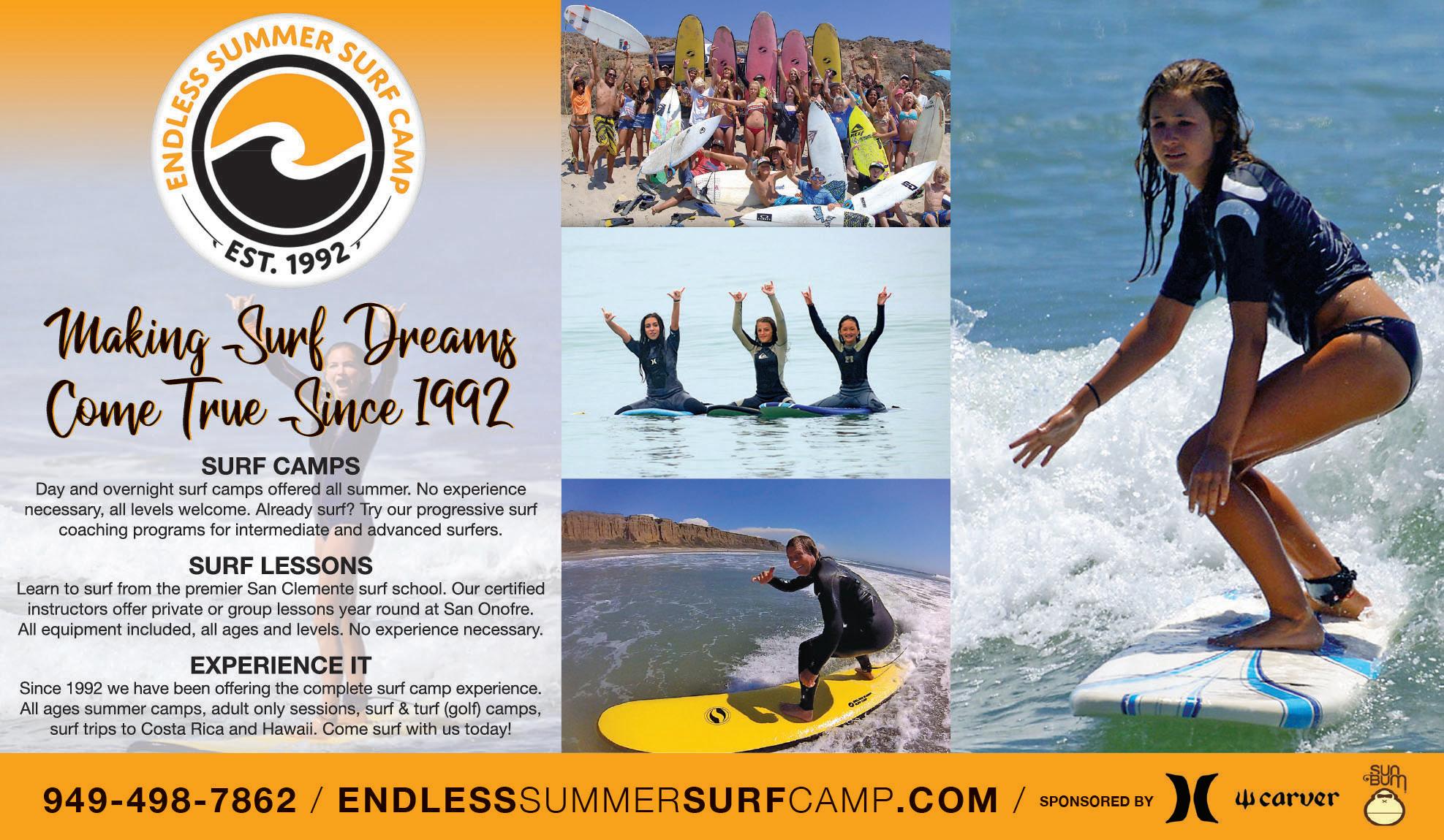 Learn to surf at San Clemente’s premier surf camp, where dreams have come true since 1992. Whether you have never surfed or if you want to take your surfing to the next level, we have surf instruction and coaching for you. We have day and overnight surf camps, as well as private and group lessons for beginners. For intermediate and advanced surfers looking to improve, we offer Elite Surf Packages that include video coaching. 949.498.7862. endlesssummersurfcamp.com.