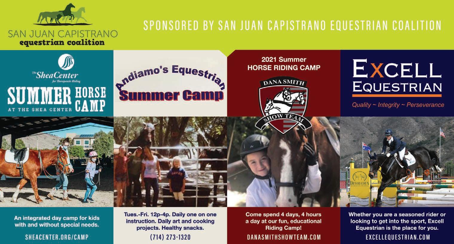 The San Juan Capistrano Equestrian Coalition proudly presents this year’s horse camps. Horse camps are a great way to introduce your child to horses and spend time outside in a COVIDfree environment. Please contact The Shea Center, Andiamo’s Equestrian, Dana Smith Show Team, and Excell Equestrian for more information! All camps are located in San Juan Capistrano at various locations (sanjuanequestrian.org).