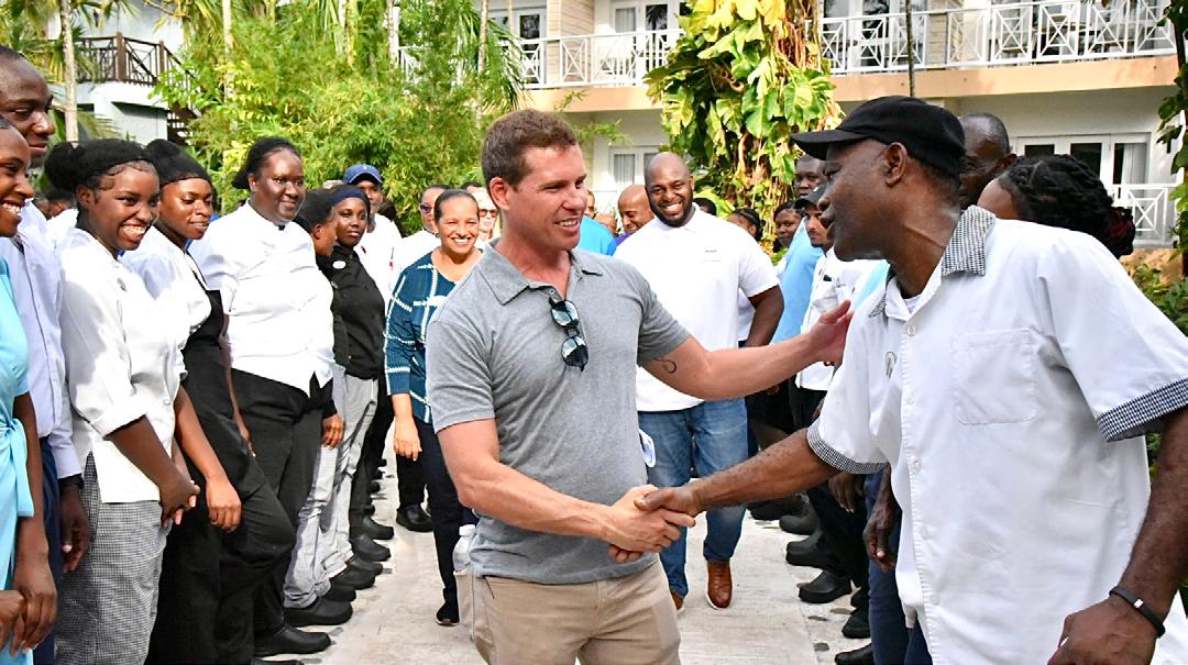 Executive Chairman of Sandals Resorts, Adam Stewart, interacts with team members during his visit to the resorts following the passage of Hurricane Melissa.