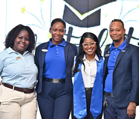 5. Top-performing female and valedictorian in the Sandals St Vincent and the Grenadines Hospitality Training Programme, Roxyanne Peters, smiles brightly as she's flanked by Resort Shop team member Jemelia, Manager Shatal Lionel, and Supervisor Ike Abbott.