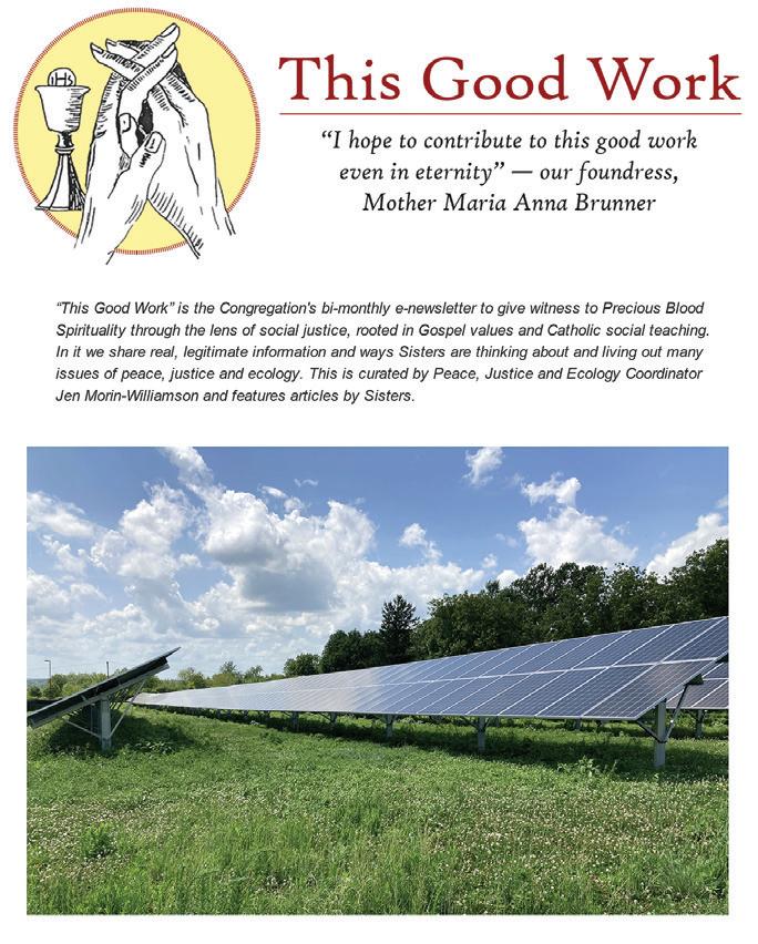 Also, I invite you to subscribe to our bimonthly online newsletter, This Good Work, which I curate. Each issue has four or five articles with a justice focus written by Sisters and guest writers. They are educational, spiritual and concise! Subscribe at preciousbloodsistersdayton.org/enewsletter-sign-up/.