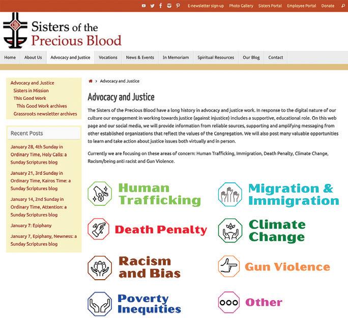 One way that we have advanced this work is to update part of our website to provide opportunities beyond our physical presence for others to learn about these issues and ways to take action. Advocacy and Justice (preciousbloodsistersdayton.org/advocacy-and-justice/) is the landing page where you can find these educational and advocacy opportunities. You can easily click on the areas that align with your concerns.