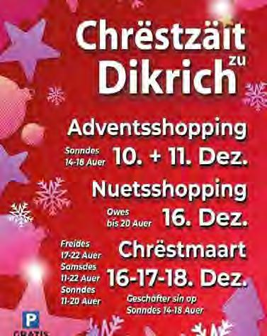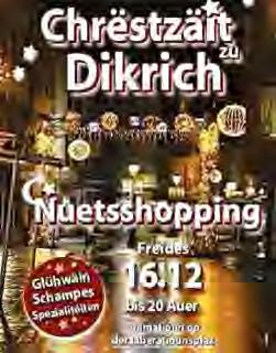 Nëmmen zesumme kenne mir vill erreechen an dohier léif Dikricher Leit a Nopesch Frënn, loosst Iech et net huele fir Fetten-Donneschdeg op den Altweiberbal an d’Brasserie beim Louis mam DJ Se7en, an de Café Miche mat Musek wei Fréier oder an de Café Dikkricher Stuff bei d’Härenequipe vum Fussball luussen ze goen.