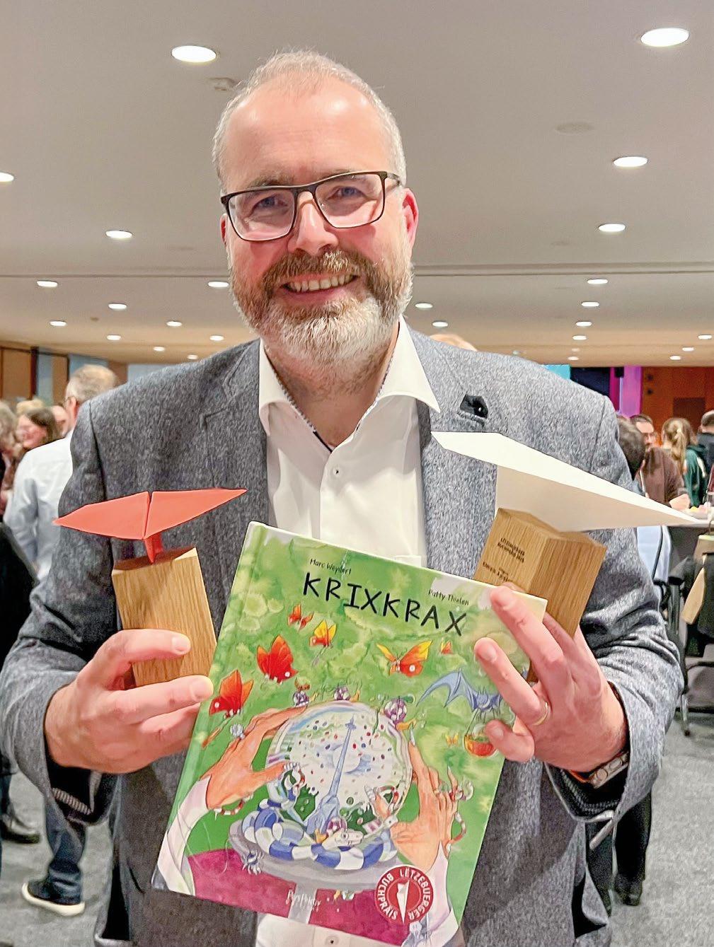 Am 13. November, vor Beginn der 30. Walfer Bicherdeeg , wurde der jährliche Lëtzebuerger Buchpräis vom Verlegerverband verliehen. In der Kategorie Kinderbuch ging der Nordstad-Autor Marc Weydert als Gewinner hervor – und das sogar zweimal. Für sein Buch Krixkrax, illustriert von Patty Thielen, die im Lycée Technique d’Ettelbruck unterrichtet, erhielt der Autor nicht nur den Jury-, sondern ebenfalls den Publikumspreis und durfte sich so gleich doppelt freuen. Krixkrax, die Geschichte vom König Mett, seinen Untertanen und einer Hexe, ist Weyderts viertes Kinderbuch, drei weitere hat er bereits angekündigt.