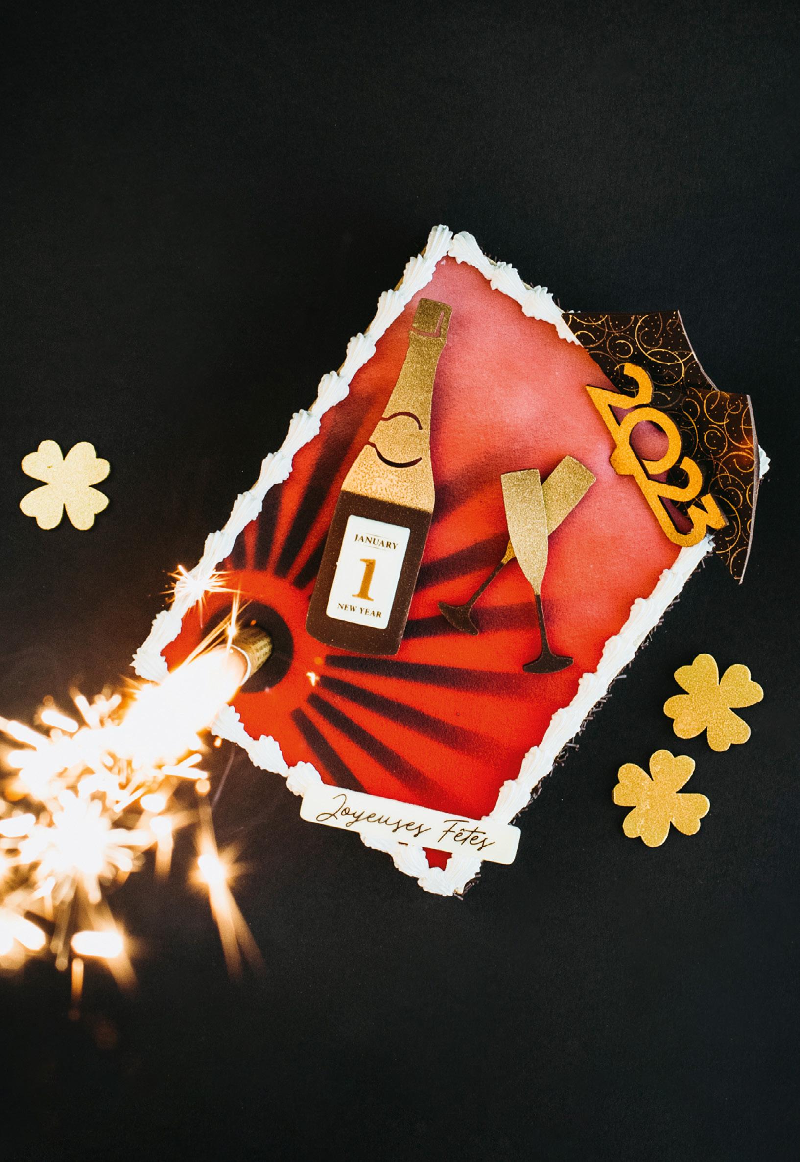 Biscuit traditionnel fourré de crème au beurre (moka, vanille, cointreau, kirsch, praliné, pistache) avec feu d’artifice
