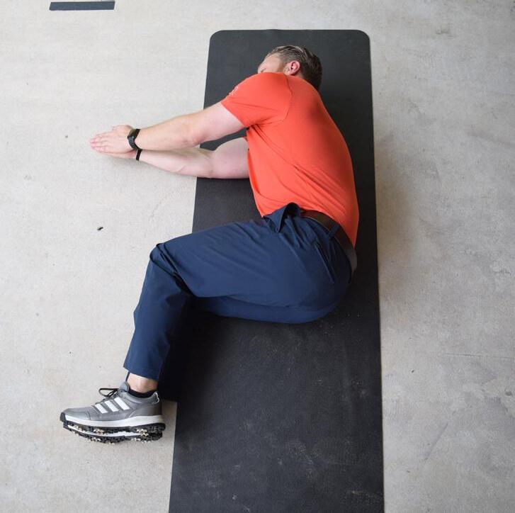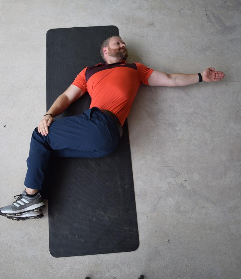 Another great drill to do after a long day on course is the ‘lying crossover stretch’. This exercise is great for ensuring the lower back and hips stay supple and free moving.