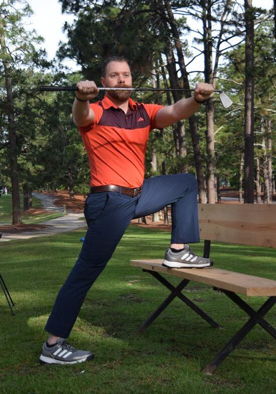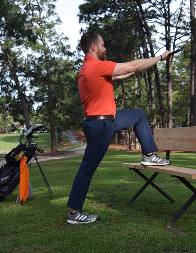 Using an elevated surface such as a bench or the side of your golf cart, place one foot in front of you at approximately knee height with the other foot on the ground.