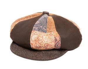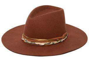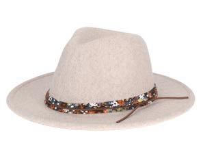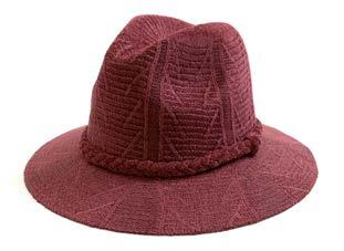 •Wool Felt Stiff Brim Fedora With Layered Raw Edge Patterned Fabric Band, Suede And Metallic Cording