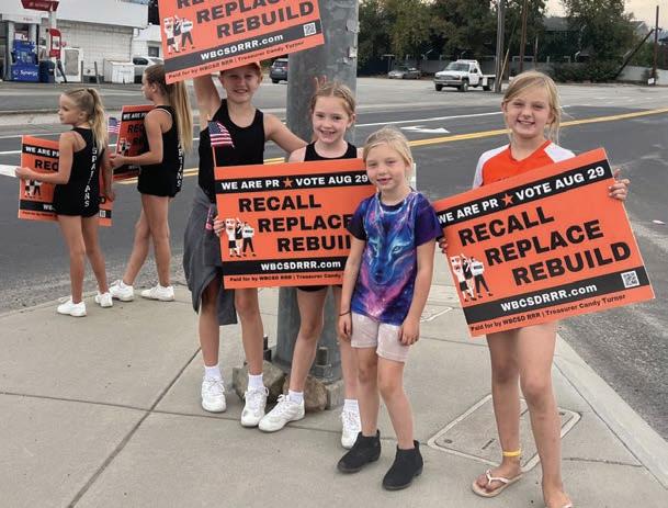 Local schoolchildren holding signs and banners to support the eventual recall of West Bonner County School District trustees Susan Brown and Keith Rutledge. Photo courtesy Idaho Education News.