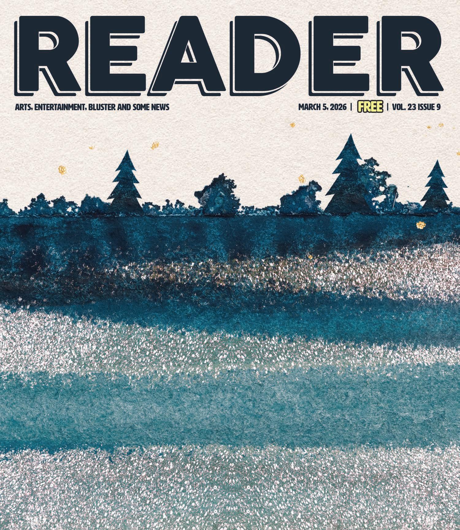The Reader is printed on recycled paper using soy-based ink. Leftover copies are collected and recycled weekly, or burned in bonfires to appease the gods of journalism. For back issues, contact the publisher. Free to all, limit two per person, please.