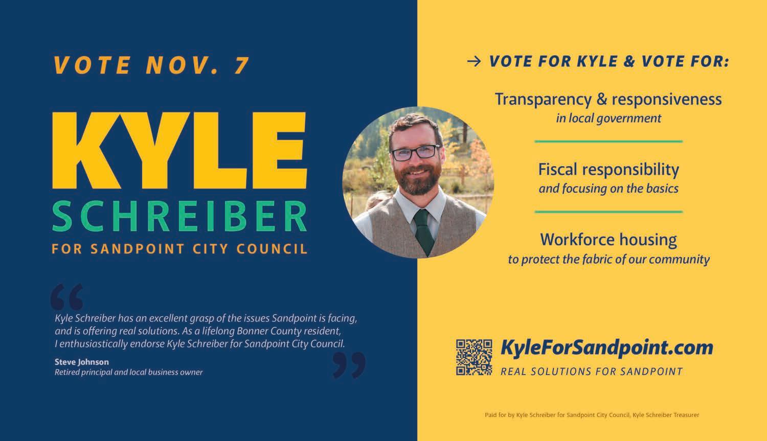 Six candidates are running for three seats on the Sandpoint City Council: Amelia Boyd, Pam Duquette, Deb Ruehle (incumbent), Kyle Schreiber, Grant Simmons and Elle Susnis. Meanwhile, three candidates are vying for Sandpoint mayor: former Sandpoint City Planner Jeremy Grimm, current City Council President Kate McAlister and Frytz Mor.