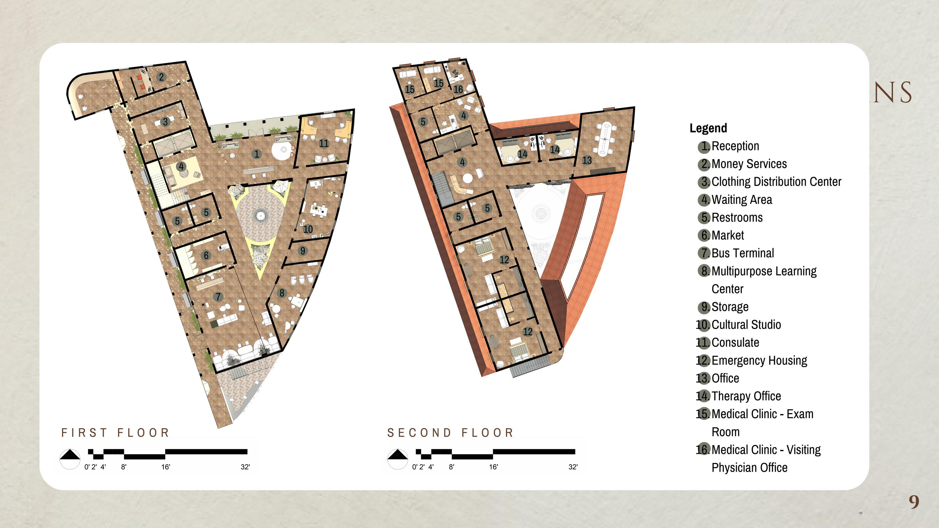 The dangers of the US-Mexico border, being split from family and the country you learned to see as home, puts a big toll on deportees (Golash-Boza, 2019). Casa Esperanza, a sanctuary for deportee reintegration, encapsulates the dedication to providing a refuge where deportees embark on a transformative journey toward self-empowerment and cultural reconnection. Through thoughtfully crafted spaces addressing physiological and psychological burdens, we foster an environment of healing and resilience with the use of Maslow’s Hierarchy of Needs, Comfort Theory & Change Theory (Kopec, 2018). Safety and security are paramount, ensuring deportees feel protected and supported as they navigate the challenges of reintegration.