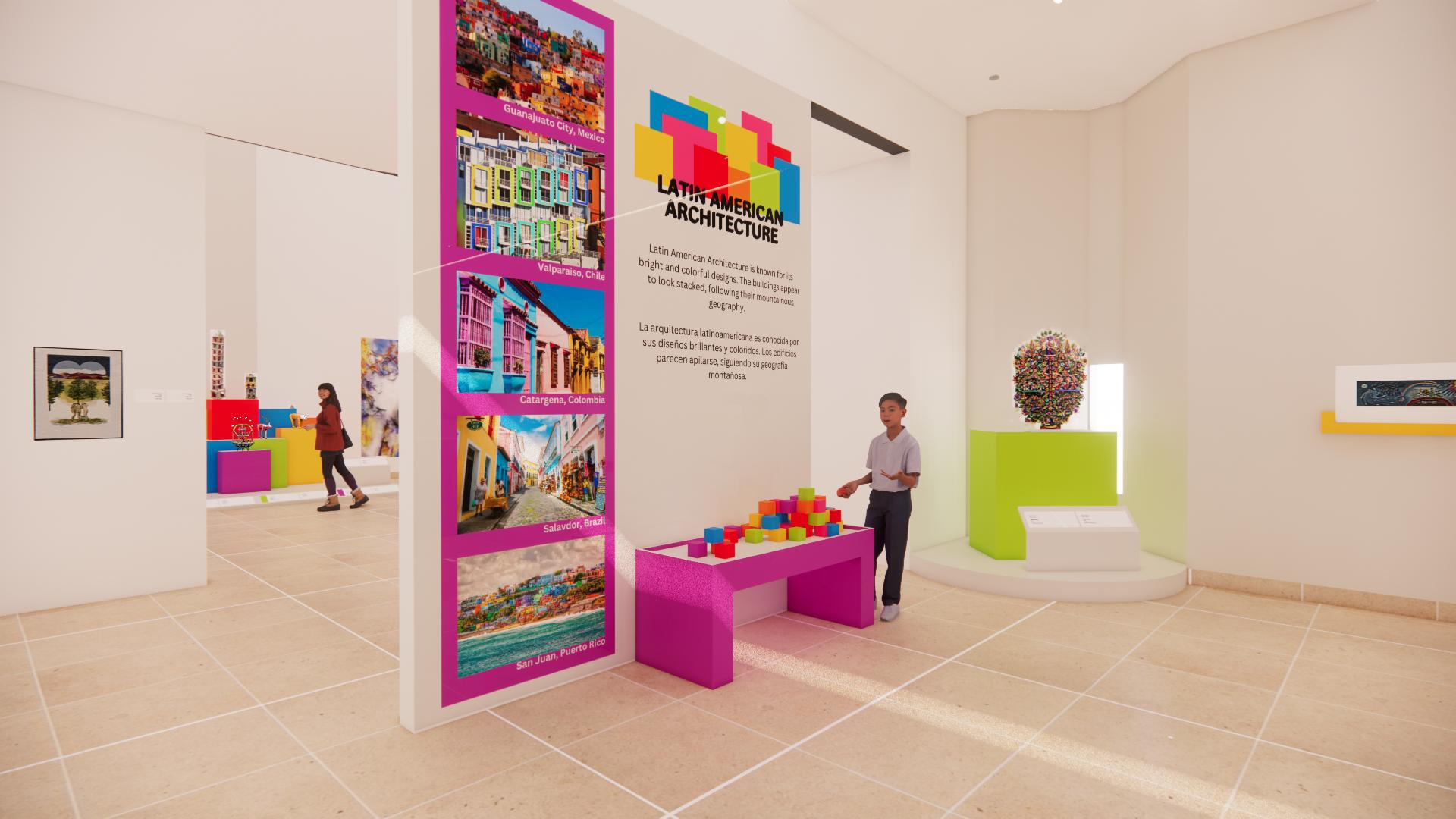 To enhance accessibility, English and Spanish art labels stand side by side, equal in prominence, fostering a dual-language experience Echoing the playful spirit of Latin American communities, an interactive area invites children to engage with colorful blocks, allowing them to recreate the iconic stacked homes of the region At the end of the exhibition, cases inspired by the stacking concept prevalent in Latin American sculptures and homes showcase the artistic heritage in a dynamic and visually striking manner