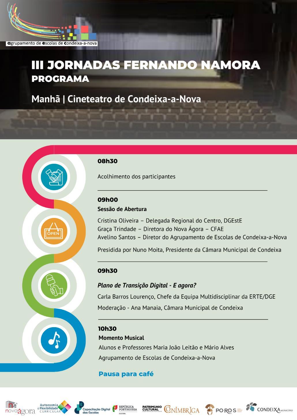1) A primeira parte do evento (até às 10h30) decorrerá no Cineteatro de Condeixa-a-Nova (Sessão de Abertura, conferência). Seguir-se-á o Coffee Break. Nota: O programa prevê 30 minutos para deslocações.