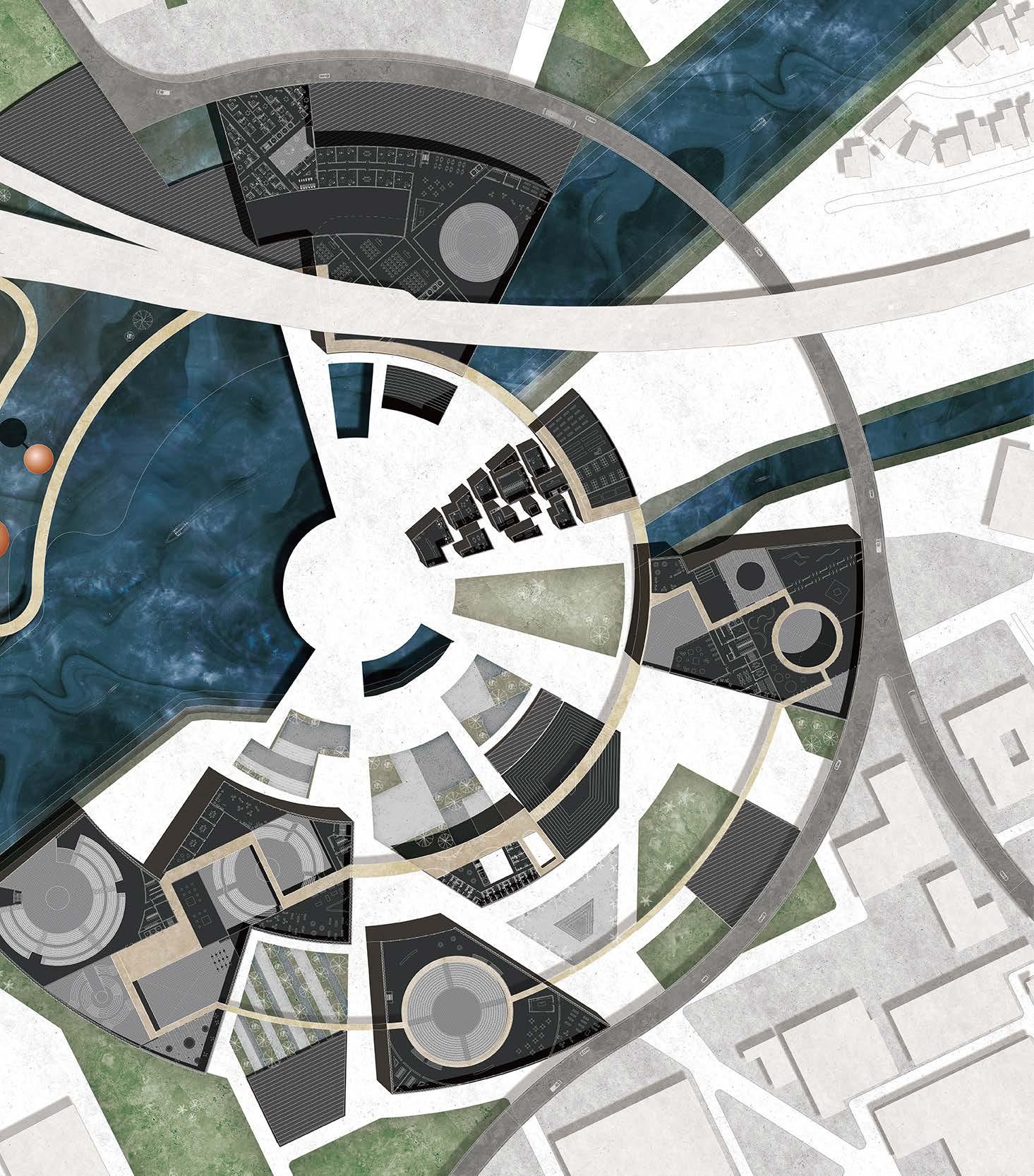 Looking into the future of stages we see a vision of truly immersive experiences of a world within a world, with each world containing its own unique characteristics, strengths, and weaknesses. Situated at the intersection of three infrastructures, the site aims to provide its audience with a choice of being among multiple dynamic theatrical worlds. By providing the audience with a choice of worlds, they have the ability to experience each world separately by simply jumping between them or simultaneously engaging in multiple.