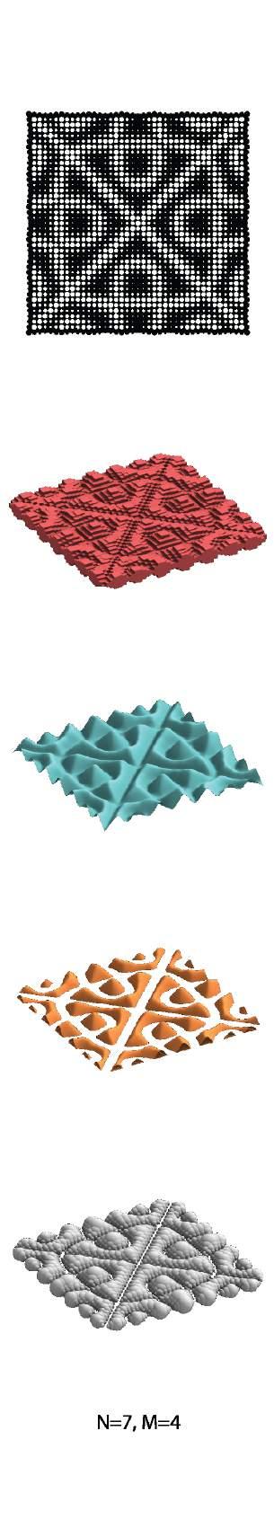 There are two prime rules that are shared by every iteration throughout the catalog. The first one is that the closer an aperture is to the curve of the cymatic pattern, the bigger it is. The second is that the farther a point on the skin is from the curve of the cymatic pattern, the thicker it is. Based on these two rules, a grid system is introduced as a point-base for the center of the aperture. The size of the aperture varies depending on its distance to the cymatic pattern, which overlays with the grid. Same method is applied to the thickness of the surface. Through this logic, four iterations are generated with different geometries.