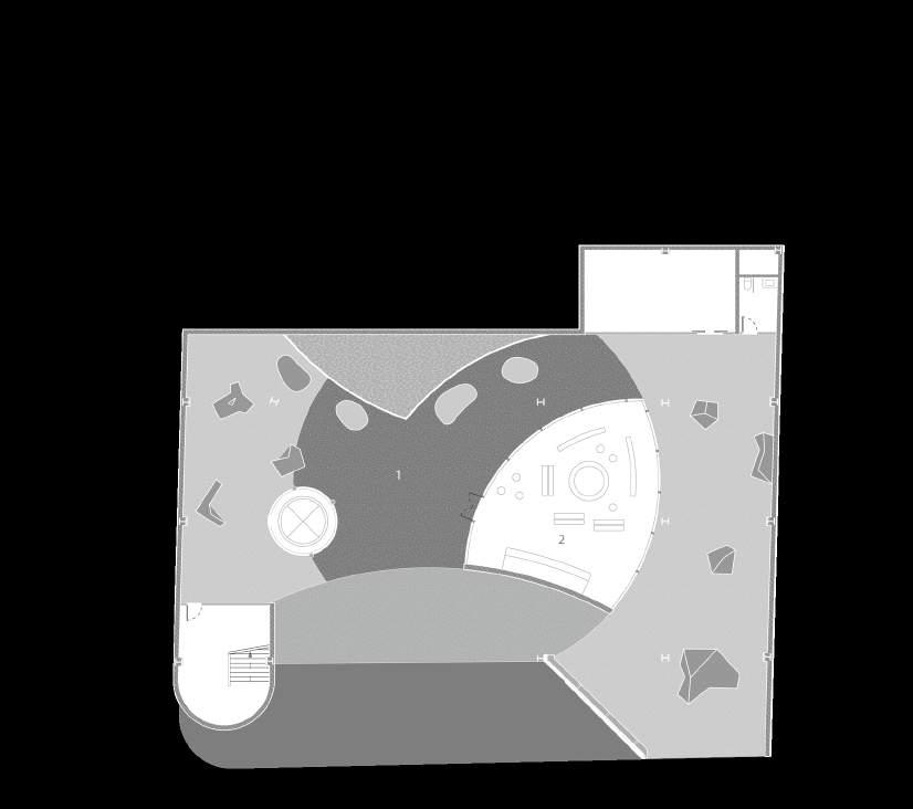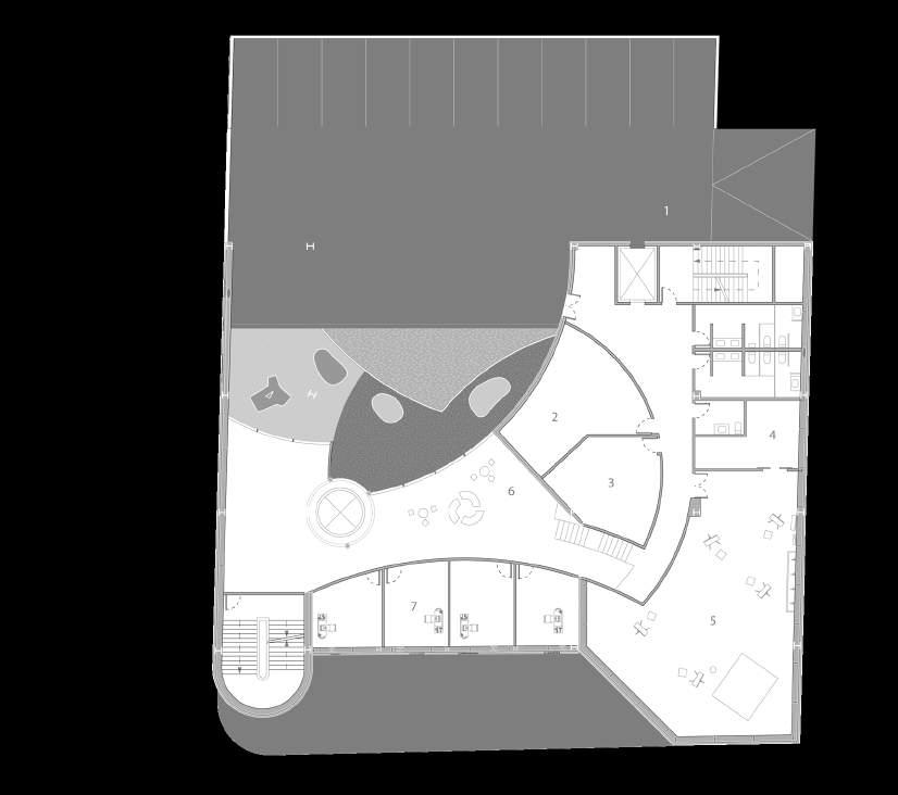 The plan is strung by a circular path switching alternately between interior, semi opened space, and exterior throughout the site. On the other hand, the transparent envelope and the plants inside and outside of it illude people' s perception of what is the interior and what is the exterior.