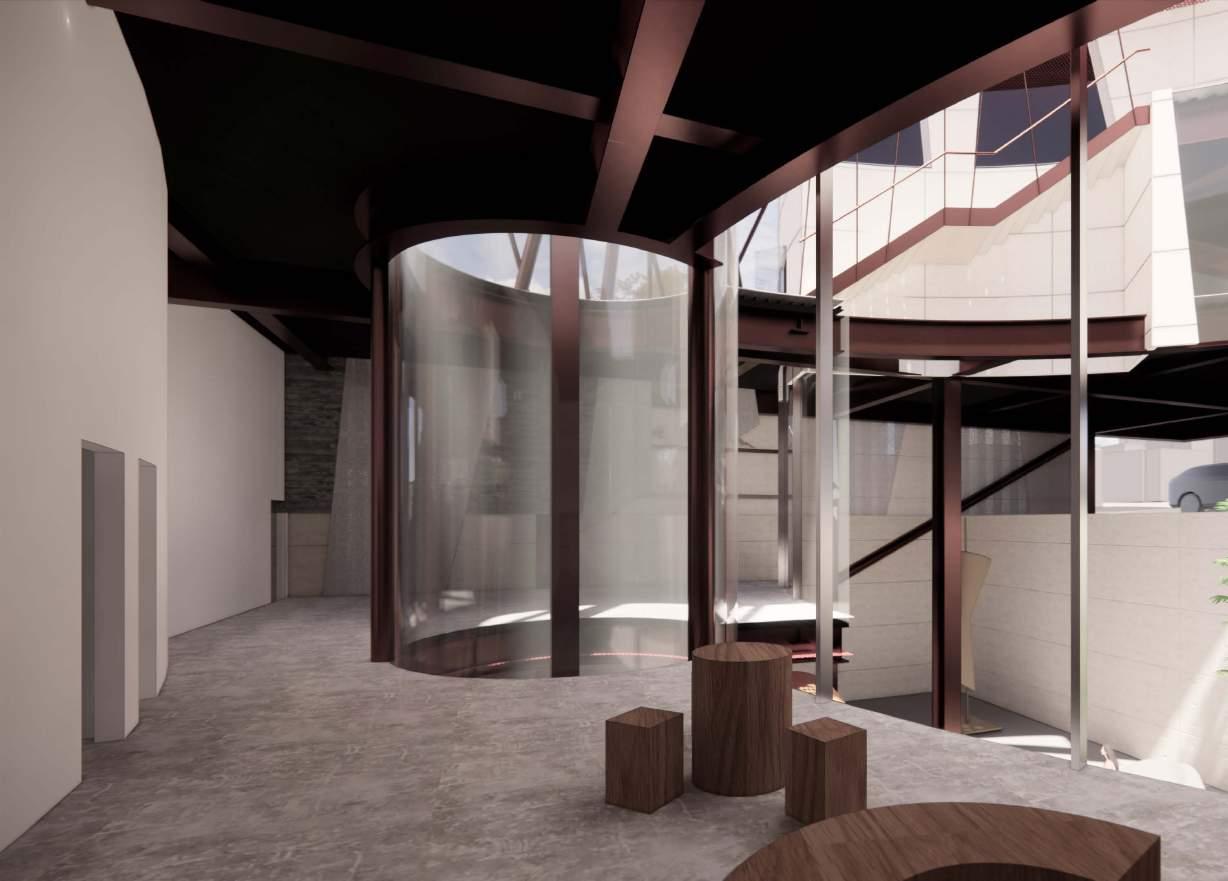 The project vacuums the interior ground floor and opens it to the sky. Meanwhile, the concrete spandrel is replaced by a concrete mass serving for the new program. To accommodate the new arts collective’s program, the project adds additional building mass on top of the existing one and divides it into 2 L-shape pavilions interlocking with each other, one serves arts creators and staff, and the other opens to the public for temporal exhibitions and conferences. The points where the 2 intersect are the fire stairs and elevators. The glass elevator gives public access from the sculpture garden on the ground floor to the exhibition spaces above. On the other hand, the staff and material supply enter the building through the service elevator at the parking deck. The cafe, serving both private and public populations, connects the 2 pavilions by a roof terrace.