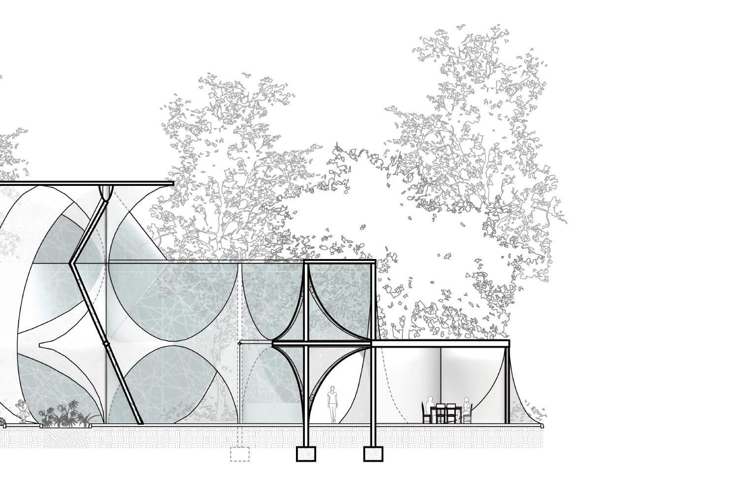 The envelope of is fixed on a set of branch-like structures. While the columns bear the loads from the above, the branch-like structure and the cables atop take the moment. The Roof, Fabric structure and the walls are then attached onto the structure.