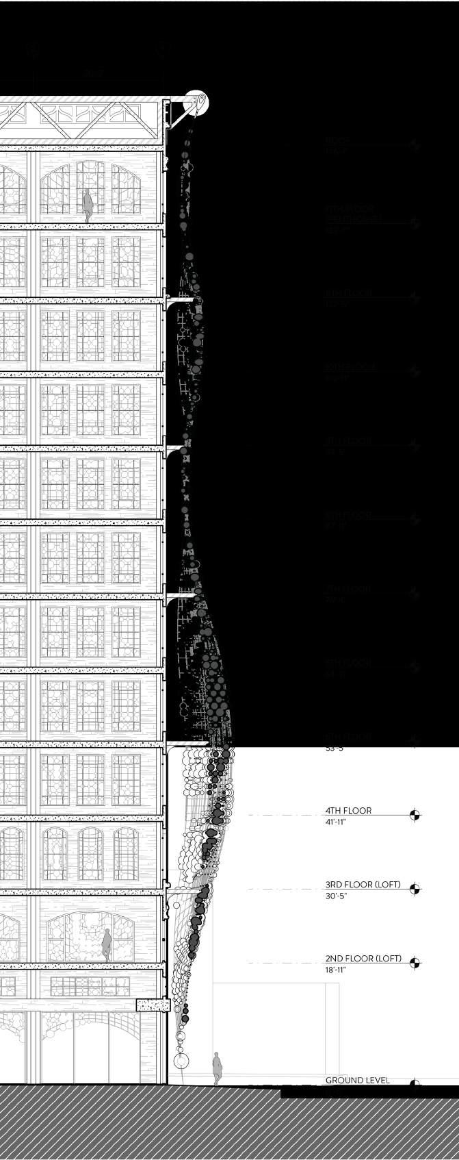 Opening in 1926, the Textile Center Building witnessed the heyday of the garment industry in the Los Angeles Fashion District. The 13-story structure was designed by architect William Douglas Lee and featured a distinctive Art Deco style, characterized by its decorative details, geometric patterns, and sleek lines. Following the relocation of textile businesses, the building was transformed into loft-style condominiums that consist of modern offices, creative studios, and retail establishments. However, the original brick envelope of the building has insufficient capability to block the noises caused by traffic around the building today. Hence, retrofitting the building to its new acoustic environment but at the same time preserving its cultural significance became the main issues of this phase.