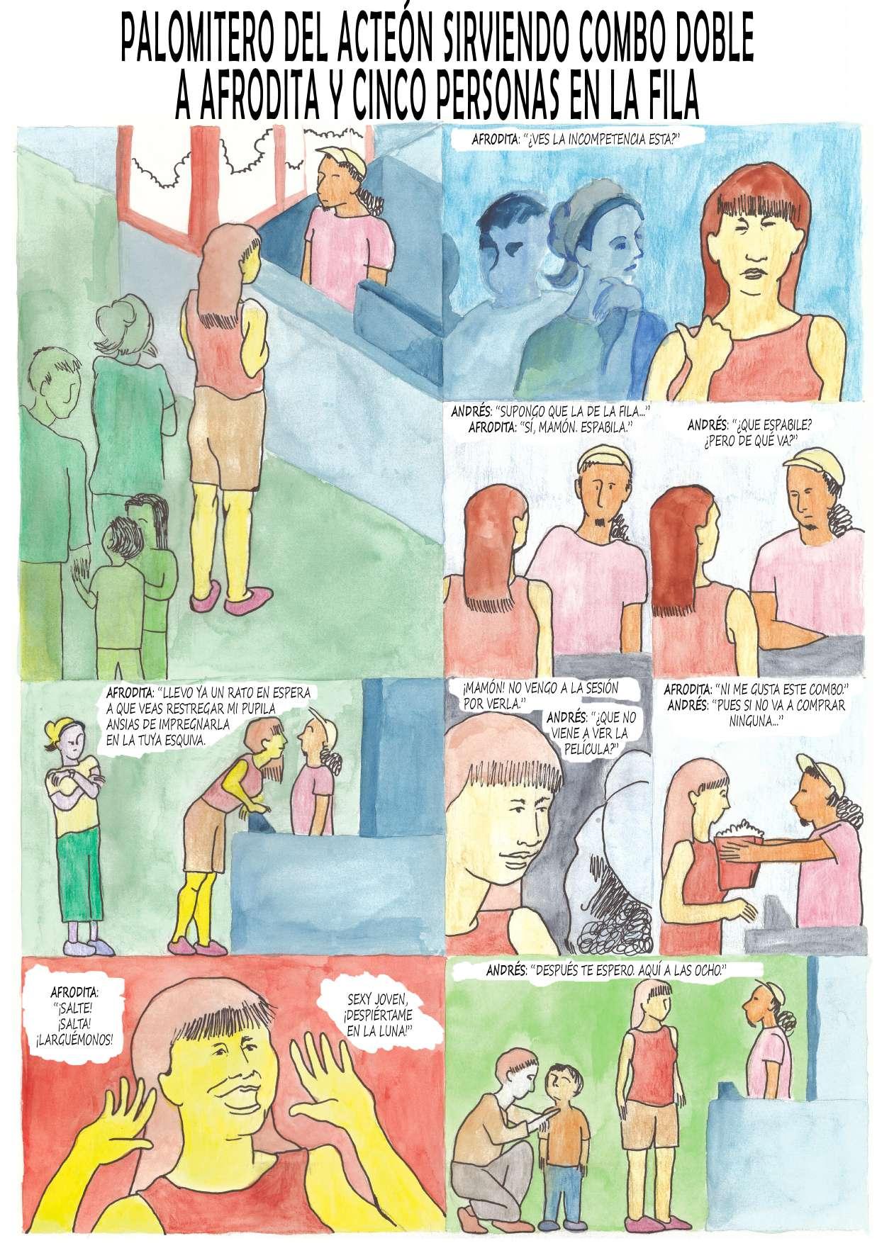 PALOMITERO DEL ACTEÓN SIRVIENDO COMBO DOBLE A AFROFITA Y CINCO PERSONAS EN LA FILA