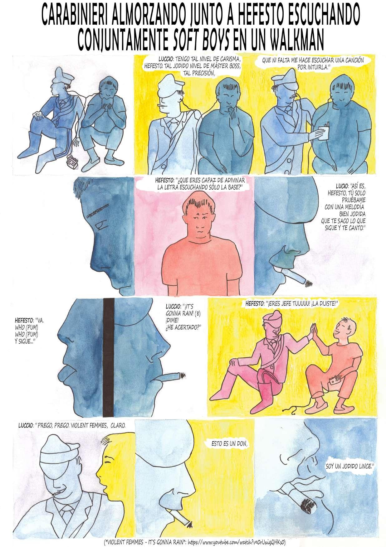 CARABINIERI ALMORZANDO JUNTO A HEFESTO ESCUCHANDO CONJUNTAMENTE SOFT BOYS EN UN WALKMAN