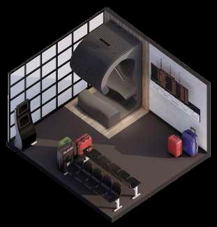 A bedroom design was proposed for a hotel service catering to both individual and tourist accommodation via web platforms. The design includes space for a king-size bed, average-sized wardrobe, and decorative shelves, optimizing storage and privacy. It features a mini social space for relaxed activities and a semi-hidden bar area with a wide selection of beverages, along with a small built-in shelf. Adjacent to the bedroom, the bathroom includes a spacious shower, a compartment for toiletries with LED lighting, and additional storage space.
