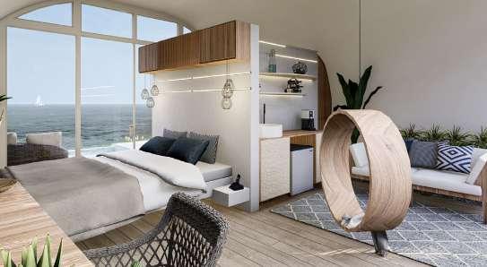 Rooms with partitioned furniture, designed in a beach-themed palette for relaxation by the sea, featuring furniture that allows for relaxation spaces and views of the surroundings.