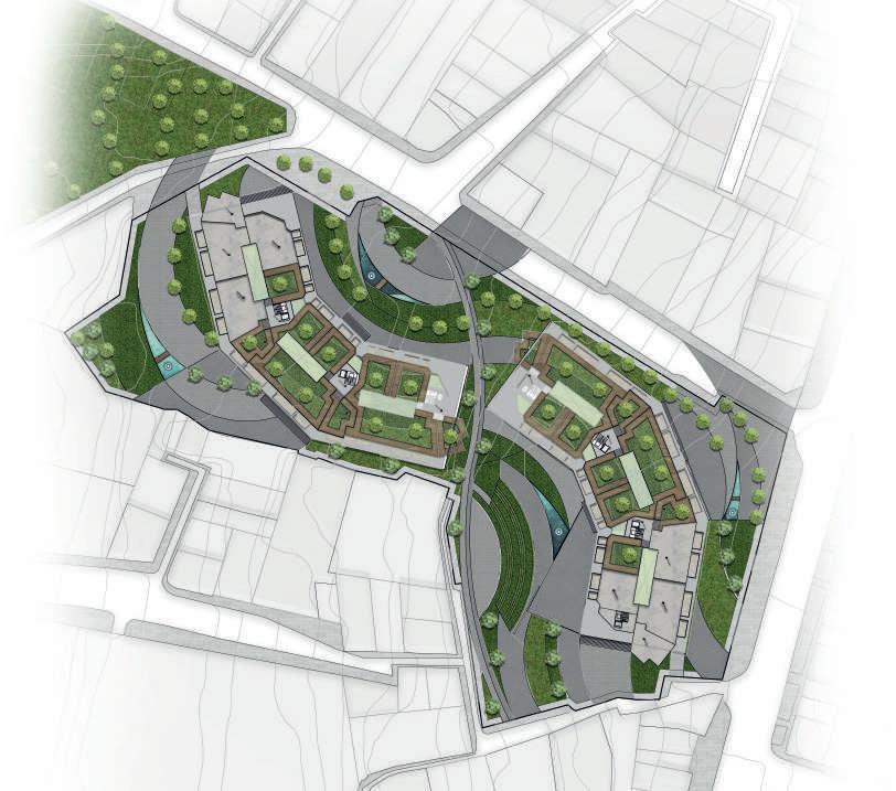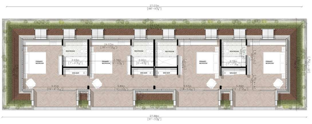 Mirror-image townhouses with a central vegetal barrier ensure privacy for users and maximize natural light into the homes. This design facilitates wellness activities such as yoga and meditation.