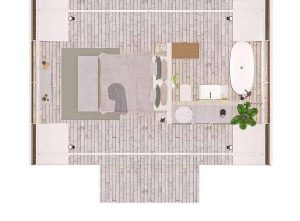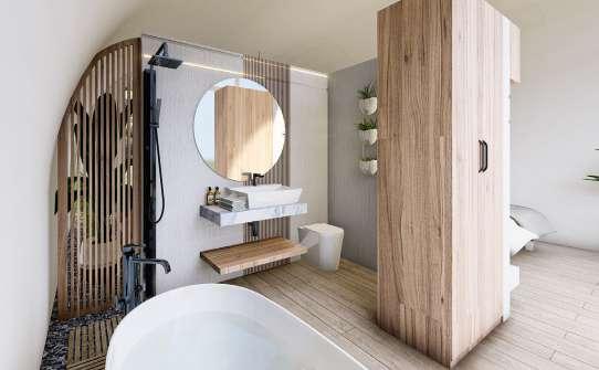 A prototype featuring four rooms, each equipped with a mini-bar, bathroom, and spacious bedroom, designed to function as either family suites or individual units.