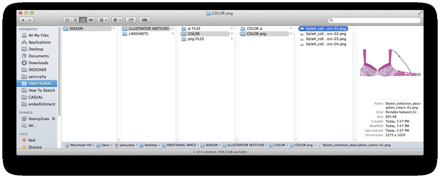It is recommended to FILE .png sketches on your DESKTOP and copy to the VICTORIA Drive under: Emotional Space>Season>Illustrator Sketches>Color> Color png (e.g. Dream Angels>Fall 2015>Illustrator Sketches>Color>Color png)