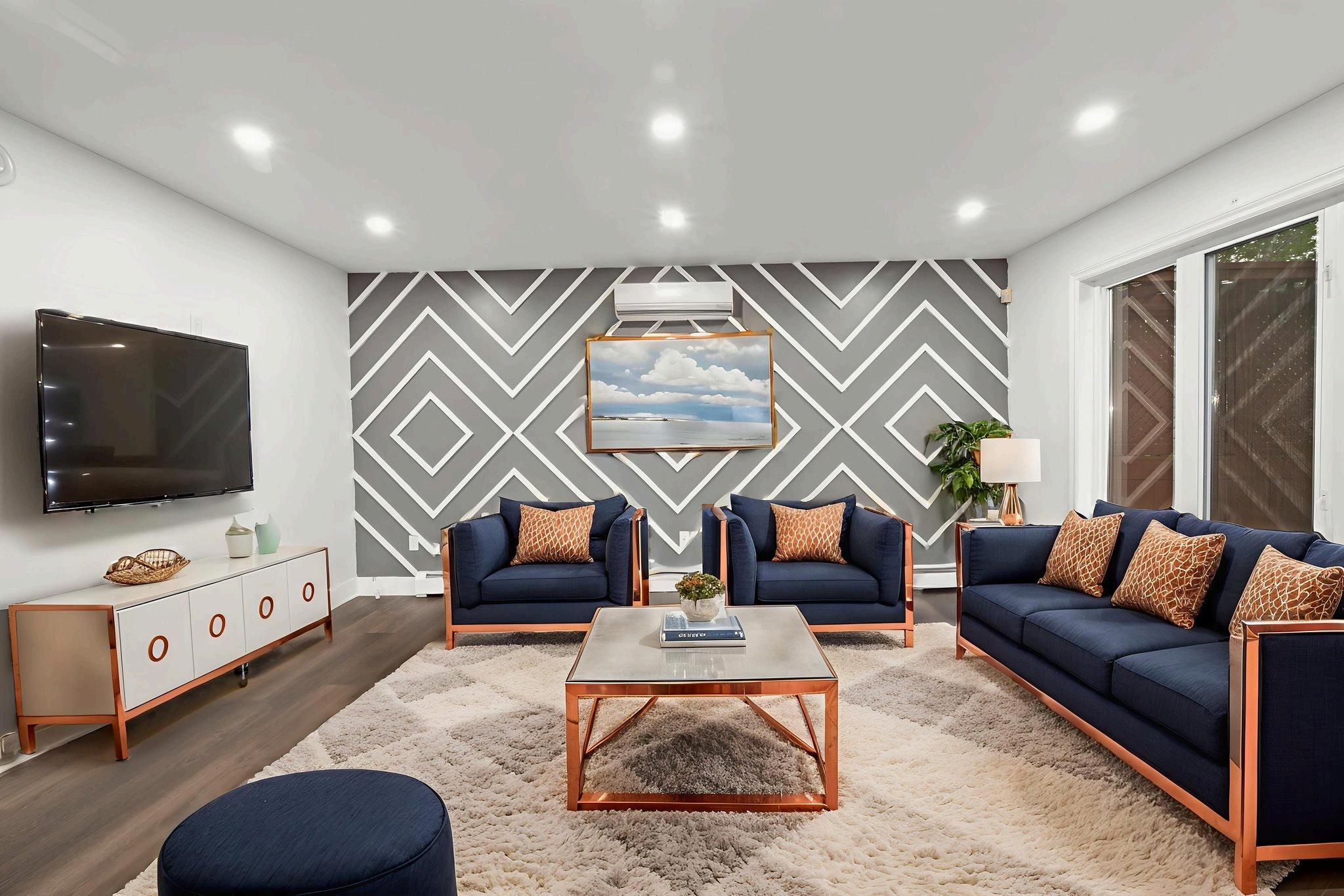 DesignDetails:NewLEDpotlights,freshpaint,andastriking staircasefeaturewall.