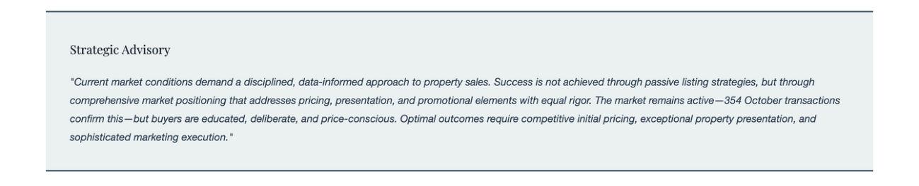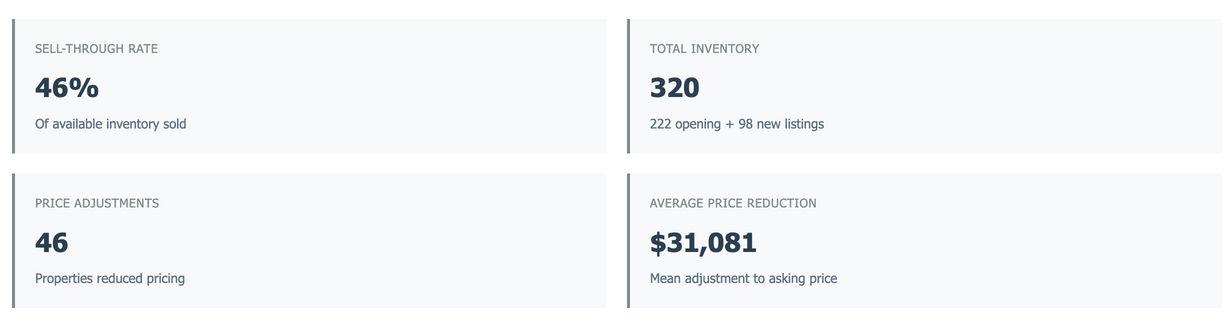 October opened with 222 active listings and added another 98 new units, bringing the total to 320. Despite this ample supply, just 57 transactions were recorded. Nearly 15% of sellers reduced asking prices, averaging a downward adjustment of $31,081, revealing how far list prices initially missed buyer...