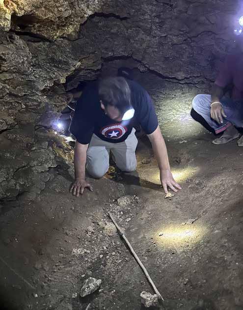 Egbert zkoumá několik vrstev mineralizovaného guana hluboko uvn itř jeskyně.