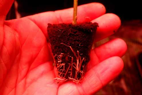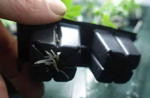 Wie immer, kamen die Samen zwischen zwei feuchte Küchenpapierschichten und nach 2 Tagen zeigte sich der Keimling. Dieser wurde vorsichtig in das mit Mykorriza-Granulat angereicherter Pflanzloch gesetzt und mit Erde bestreut. Drei Tage später durchbrach die Pflanze die Erde und streckte sich dem Licht entgegen. In den ersten Tagen zeigte sie bereits Vitalität und Stabilität. Gegossen habe ich ausschließlich mit Regenwasser.