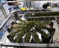 Frisch geerntete Pflanzen werden maschinell getrimmt.