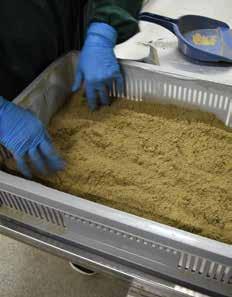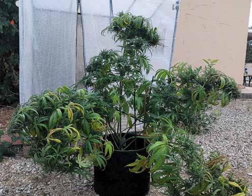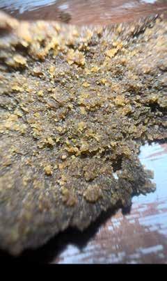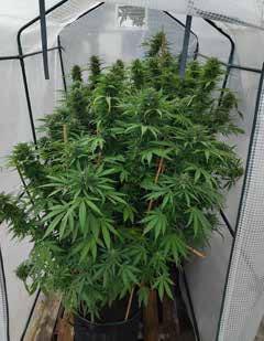 An Blütetag 63 überprüfte ich die Trichome mit einer Lupe. Ein kleiner Teil zeigte zu meinem Erstaunen bereits eine bernsteinfarbene Trübung, der Großteil war milchig und nur ein winziger Anteil klar. Die Pflanze hatte eine Endhöhe von 68 Zentimetern erreicht und eine Streckung von über 100 % hingelegt. Ich schnitt die Pflanze am Hauptstamm ab und hängte sie kopfüber in den Trockenschrank. Dort trocknete sie 15 Tage bei 13 bis 16 °C und 55 % Luftfeuchtigkeit. Wie sich herausstellte, waren die kühleren Temperaturen ideal für ein schonendes Trocknen. Danach erfolgte der Feintrimm über einen Siebdruckrahmen. Die abfallenden Trichome wurden gesammelt und später für Hasch verwendet. Nach dem Trimmen wog ich 28 Gramm. Anschließend durften die Blüten sechs Wochen in Grove Bags aushärten. Während des Curing veränderte sich das Aroma deutlich. Die anfängliche Waldfrucht-Zitrus-Note wich einem Duft, der an ein Vanille- Zitrone-Gebäck erinnerte, während die Waldfrucht dezent im Hintergrund blieb.