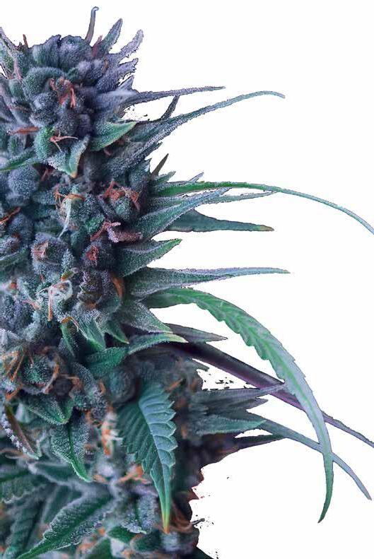 Kaum begann die Blüte, streckte die Pflanze ihre Triebe kräftig nach oben. Wöchentlich erhöhte ich die Düngermenge. Bereits an Blütetag 16 zeigten sich die ersten weißen Blütenstempel, die eindeutig auf eine weibliche Pflanze hinwiesen. In den folgenden Tagen und Wochen intensivierte sich die Streckung und die Blätter nahmen ein sattes Lila an. Gleichzeitig explodierte die Harzproduktion. Der Anblick von violetten Blättern und funkelnden Trichomen war atemberaubend. Die Lilafärbung könnte durch kühle Nachttemperaturen oder die Genetik bedingt sein. Andere Strains im Zelt zeigten allerdings keine vergleichbare Färbung.