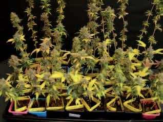Estábamos muy emocionados con nuestro primer cultivo de guerrilla y nuestro optimismo nos superó con creces. Hicimos muchos más esquejes de los que realmente después pudimos plantar. Cavamos y cavamos todos los agujeros que pudimos pero no dimos abasto. Nos encontramos con los sobrantes y los cuartos de cultivo interiores ocupados ya por las plantas en floración, las madres y las plantas en crecimiento que esperaban a ser cambiadas a 12 horas. No sabiendo que hacer con ellos y sin previsión futura de cambio decidimos introducir los clones sobrantes en el cuarto de floración y ver cuál era el resultado. Desde que empezamos a cultivar nunca hemos tenido un monocultivo, siempre hemos disfrutado de un variado jardín de las delicias y los esquejes que teníamos preparados eran también bastante diversos, por lo que pudimos observar distintas reacciones según el tipo de planta. Las mini plantas florecieron sin problema. La aplicación de abonos fue idéntica a la de las plantas en macetas de mayor tamaño situadas en el mismo cuarto, la única diferencia era la cantidad de riego. Las flores se formaron como lo hacían siempre y estuvieron maduras en el momento que les correspondía según la variedad. La cantidad de tricomas parecía ser mayor en estas pequeñas plantas, debido posiblemente al estrés producido por estar en un contenedor tan pequeño y a que únicamente hay unos pocos cogollos donde concentrar la energía. El resultado del primer cultivo con mini plantas fue muy satisfactorio.