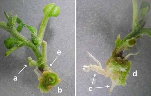 Aspecto de un explanto nodal tras varias semanas de cultivo, se observan el peciolo inicial con una leve formación de callo (a), corte transversal del callo (b), formación de raíces secundarias (c), callo (d) y tallo del explanto nodal inicial (e).