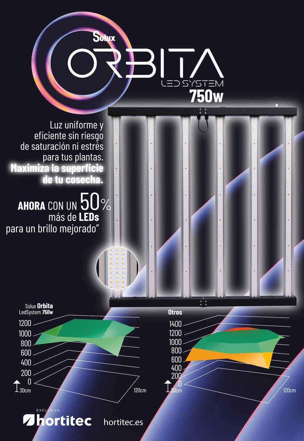 el ciclo del cultivo, desde las primeras fases hasta la floración, proporcionando siempre la cantidad de luz adecuada para estimular la fotosíntesis y un desarrollo vigoroso. Su diseño combina ingeniería y practicidad. Las 6 barras LED aseguran una distribución de luz uniforme con un ángulo de 120°, de modo que todas las plantas reciben una iluminación homogénea, incluso en las esquinas del cultivo. El cuerpo robusto con protección IP65 lo hace resistente al agua y al polvo, ideal para salas de cultivo y entornos húmedos, y su vida útil de 60.000 horas garantiza años de uso estable. Además, las barras son fáciles de instalar y mantener, y el conjunto mantiene un formato compacto (110,5 × 107 × 7,2 cm) con un peso de 10,5 kg, pensado para integrarse cómodamente en la mayoría de armarios y salas. Donde el Vega Pro 720W marca la diferencia es en el control. El regulador de potencia permite seleccionar diferentes niveles de intensidad (EXT/OFF/100%/80%/60%/40%), adaptando la luz a cada fase del cultivo y a las necesidades de cada espacio, lo que se traduce en mayor precisión y ahorro energético. Con un PPF de hasta 2.012 µmol/s, una eficiencia lumínica de alto nivel y una construcción preparada para trabajar en condiciones exigentes, el sistema LED Vega Pro 720W se posiciona como una opción sólida para cultivadores exigentes que buscan productividad, fiabilidad y un consumo optimizado en sus instalaciones de interior.
