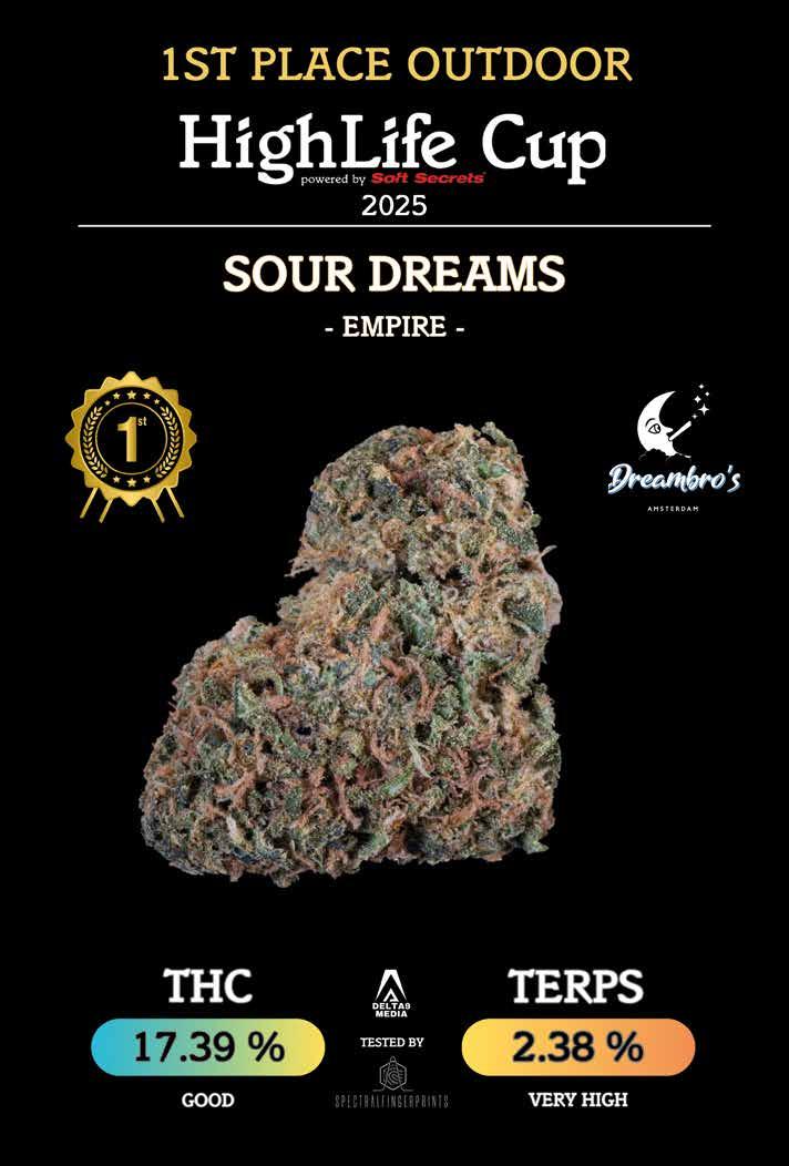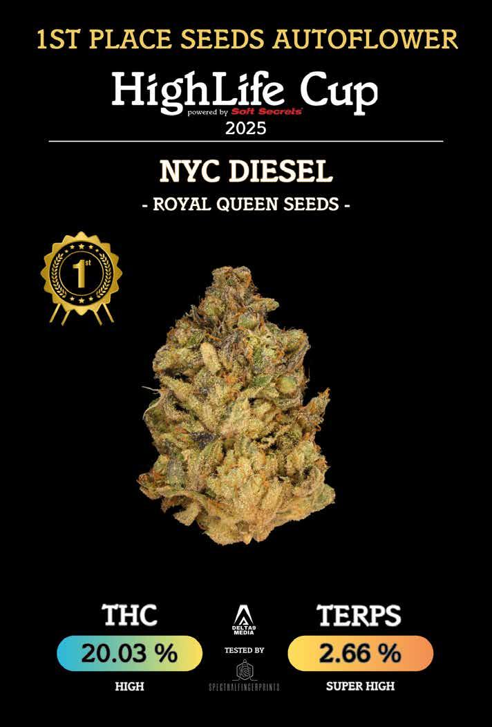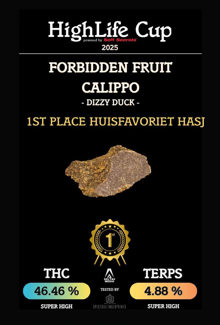 In deze HighLife zien jullie paginagroot de laatste winnaars van de HighLife Cup 2025, want in het komende nummer lezen jullie weer alles over de nieuwste editie van de HighLife Cup. De foto’s zijn in high resolution gemaakt door Delta 9 Media, waarbij ook het resultaat van het laboratoriumrapport wordt afgebeeld. In deze editie zijn dat de winnaars in de categorieën Seeds Autoflower (NYC Diesel, Royal Queen Seeds), Outdoor (Sour Dreams, coffeeshop Empire, Haarlem) en Huisfavoriet Hasj (Forbidden Fruit Calippo, Dizzy Duck, Den Haag). Iedereen heeft toegang tot de volledige laboratoriumresultaten van alle inzendingen voor de HighLife Cup 2025. Alle hires foto’s en labresultaten zijn te downloaden via www.delta9-media.com/HighLifecup-2025.