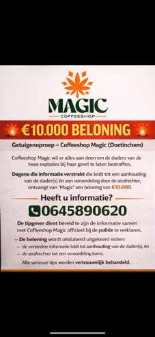 Na de heropening op 15 februari is het rustig gebleven. Er is nóg meer beveiliging die dag en nacht de omgeving in de gaten houdt en er hangen nóg meer camera’s. ‘We laten ons niet intimideren’, is de houding bij Magic. Vandaar de fikse beloning. Op de flyer die verspreid is, staat het volgende: €10.000 BELONING – Getuigenoproep Coffeeshop Magic (Doetinchem). Coffeeshop Magic wil er alles aan doen om de daders van de twee explosies bij haar gevel te laten bestraffen. Degene die informatie verstrekt die leidt tot een aanhouding van de dader(s) én een veroordeling door de strafrechter, ontvangt van “Magic” een beloning van €10.000. HEEFT U INFORMATIE? BEL: 06-45890620. De tipgever dient bereid te zijn de informatie