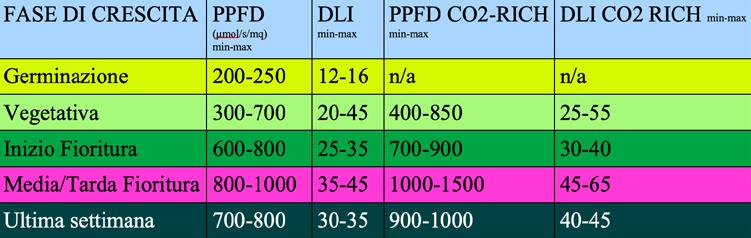 fino a raggiungere la quota di 70 DLI. Alcuni growers sostengono di arrivare a questo valore impiegando tecniche definite extreme, con alti livelli di fertilizzazione e ambienti quasi saturi di anidride carbonica che toccano 1800-2000 ppm.