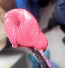 L'hash rosin è un Ice-lator pressato a tra i 65/90 e gradi con una pressa da 15 tonnellate che noi utilizziamo con 5 tonnellate di pressione. In questa maniera non solo abbiamo ottenuto un Ice dal colore viola, ma anche l'hash rosin è venuto della stesso colore! Poi in base alle quantità di antocianine che si utilizzano si possono ottenere anche altri colori dal rosa MAJIN BUU di Dragonball fino a un fucsia fluo. Una volta terminato il processo di amalgama, lo abbiamo provato e abbiamo notato che il residuo che rimane sul quarzo del banger della pipa, ossia la sua camera di combustione, si era ormai volatilizzato e che era simile al materiale residuo post combustione di un estratto senza colore aggiunto.