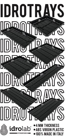 Idrotrays® è la nuova una gamma di vassoi in plastica ABS disponibile in 7 diverse configurazioni.I vassoi della gamma Idrotrays sono realizzati al 100% in Italia con plastiche ABS vergini di 4mm di spessore che garantiscono un’ alta qualità del prodotto, un’ottima integrità, resistenza agli urti, spessore uniforme e una lunga durata. Sono BPA free e completamente riciclabili. Tutti i vassoi dopo lo stampaggio in termoformatura sottovuoto vengono rifiniti utilizzando una fresa CNC guidata al laser per ottenere una bordatura raffinata. Sono pensati per poter essere perfetti in qualunque appliccazione con tutte le tecniche di coltivezione e tutti i tipi di substarto. Si adattano a tutti gli spazi di coltivazione.