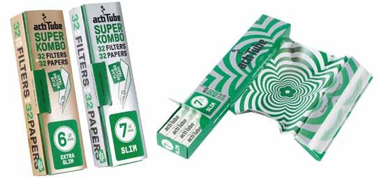actiTube SUPERKOMBO – zestaw typu „wszystko w jednym”. Zestaw actiTube SUPERKOMBO zawiera wszystko, czego potrzebujesz do uzyskania idealnego skręta. W każdym zestawie są 32 bibułki jakości premium oraz 32 filtry z węglem aktywnym (dostępne w wersji EXTRA SLIM 6 mm lub SLIM 7 mm) oraz opatentowana, składana tacka do skręcania – wszystko w eleganckim, kieszonkowym opakowaniu.
