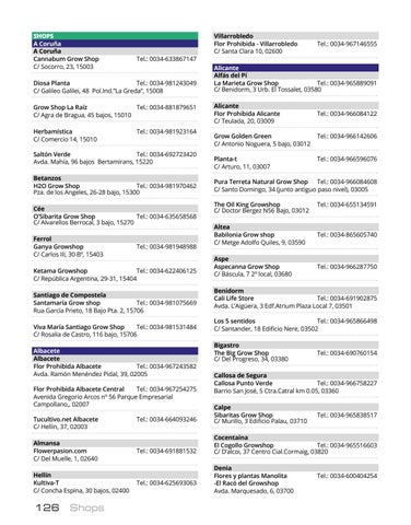 Saltón Verde Tel.: 0034-692723420 Avda. Mahía, 96 bajos Bertamirans, 15220 Betanzos H2O Grow Shop Tel.: 0034-981970462 Pza. de los Angeles, 26-28 bajo, 15300 Cée O’Sibarita Grow Shop Tel.: 0034-635658568 C/ Alvarellos Berrocal, 3 bajo, 15270 Ferrol Ganya Growshop C/ Carlos III, 30 Bº, 15403